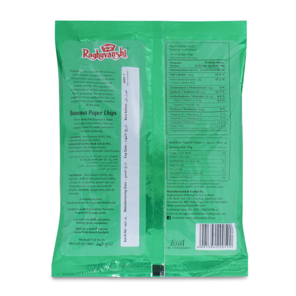 Ingredients– Raw Banana (65%), Veg Refined Palmolein Oil (30%), Iodized Salt(1.8%), Rock Salt(0.5%), Black Pepper, Dry Mango Powder, Cumin seeds powder, Coriander seed powder
